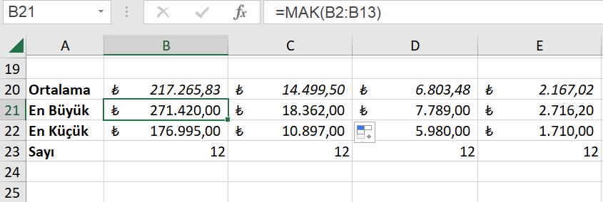 B21’deki maximum hesaplama için Otomatik Toplam listesinden Max’ı seçiyoruz. Ve yine, hücre aralığını değiştirmemiz gerekiyor. Böylece bu, aralığımızdaki en düşük değeri hesaplar. Ve E sütununa kadar doldurun. Ve minumum hesaplama için listeden Min’i seçiyoruz. Ve sonra aralığı değiştirin. Ve bir kez daha formülü kopyalayın. Bu, aralıkdaki en yüksek değeri hesaplar. B23’te, temelde sadece seçilen aralıkta var olan değerlerin sayısı anlamına gelen Sayıyı hesaplayacağız. Bu yüzden listeden Count Numbers’ı seçiyoruz. Ardından aralığı değiştirin.
