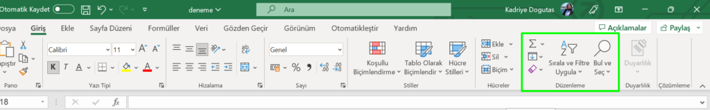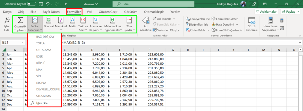 Home sekmesinde Editing grubunda AutoSum açılır listesine tıklıyoruz ve Ortalama’yı seçiyoruz. Şimdi, Otomatik Toplam, sütunda doğrudan üstündeki değerleri toplamaya çalıştığı için, buradaki hücre aralığını B2 ila B13 olarak değiştirmemiz gerekiyor. Ardından, daha önce gördüğümüz gibi var olan formülü E sütununa kopyalayabiliriz.