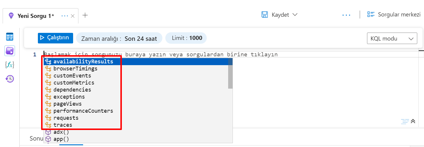 Kusto Query Language (KQL) kullanarak Azure Application Insights içindeki verileri analiz ederken, belirli veri tabloları (başlıklar) kullanılır. Bu başlıklar, uygulamanızdan toplanan çeşitli veri türlerini temsil eder.