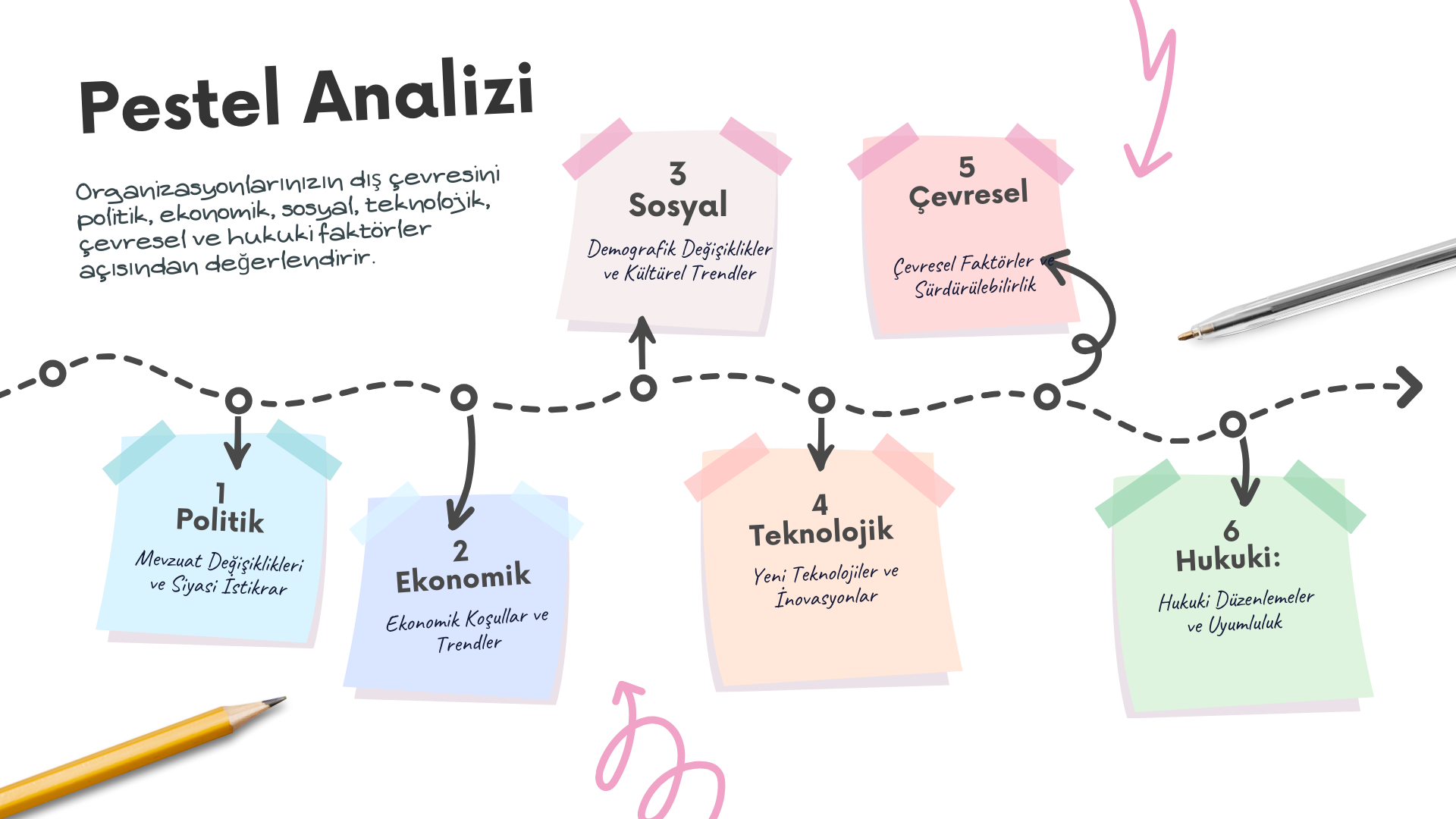 PESTEL analizi, organizasyonlarımızın dış çevresini politik, ekonomik, sosyal, teknolojik, çevresel ve hukuki faktörler açısından değerlendirir. Bu analiz, stratejik planlama sürecinde bize geniş bir perspektif sunar.