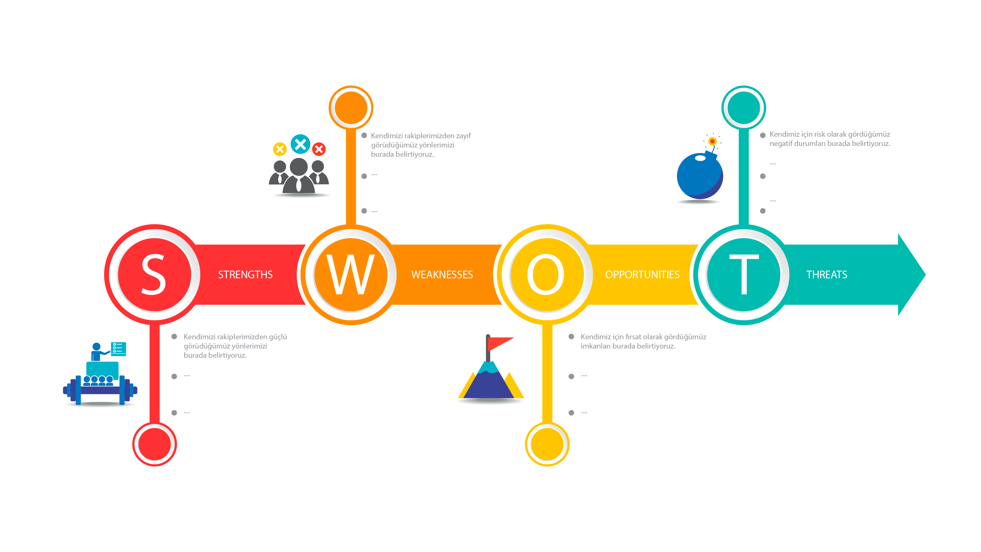 Tehditler: Potansiyel Riskler Tehditler, organizasyonlarımızı olumsuz etkileyebilecek dış faktörlerdir. Ekonomik durgunluk, artan rekabet veya değişen mevzuatlar gibi tehditler, stratejik planlarımızı olumsuz etkileyebilir. Bu tehditleri belirleyerek, riskleri minimize etmek için stratejiler geliştirmeliyiz.